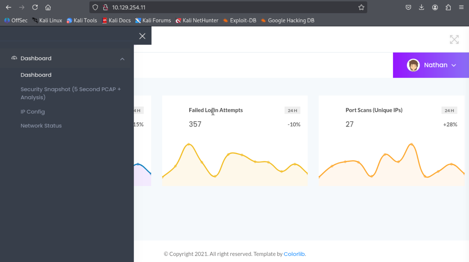 Port 80 hosts a web application dashboard that appears to be logged in as the user Nathan. The dashboard displays several static statistics such as failed login attempts and port scan activity. The navigation bar includes Dashboard, Security Snapshot (5 Second PCAP + Analysis). IP Config, Network Status. The IP Config & Network Status pages only display basic network information and do not appear to provide any interactive functionality.