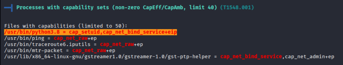 After reviewing the output of LinPEAS, it revealed that Python 3.8 is installed (which was also hinted by the earlier Nmap scan) and that the binary /usr/bin/python3.8 has the cap_setuid capability assigned. In Linux, capabilities provide a more fine-grained privilege model by splitting traditional root privileges into smaller units. Instead of granting a binary full SUID root privileges, specific capabilities can be assigned to allow only certain privileged operations. One such capability is: CAP_SETUID. This capability allows a process to change its user ID (UID) to any other user, including root (UID 0).