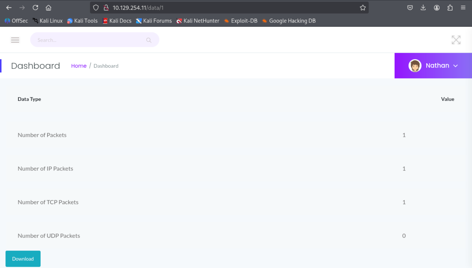 While examining the download functionality, it was noticed that the request URL appears to accept a numeric identifier: http://10.129.254.11/data/1 . This behavior suggests that the application may be using incremental IDs to reference PCAP files. Such implementations can sometimes lead to Insecure Direct Object Reference (IDOR) vulnerabilities if access control checks are not properly enforced.