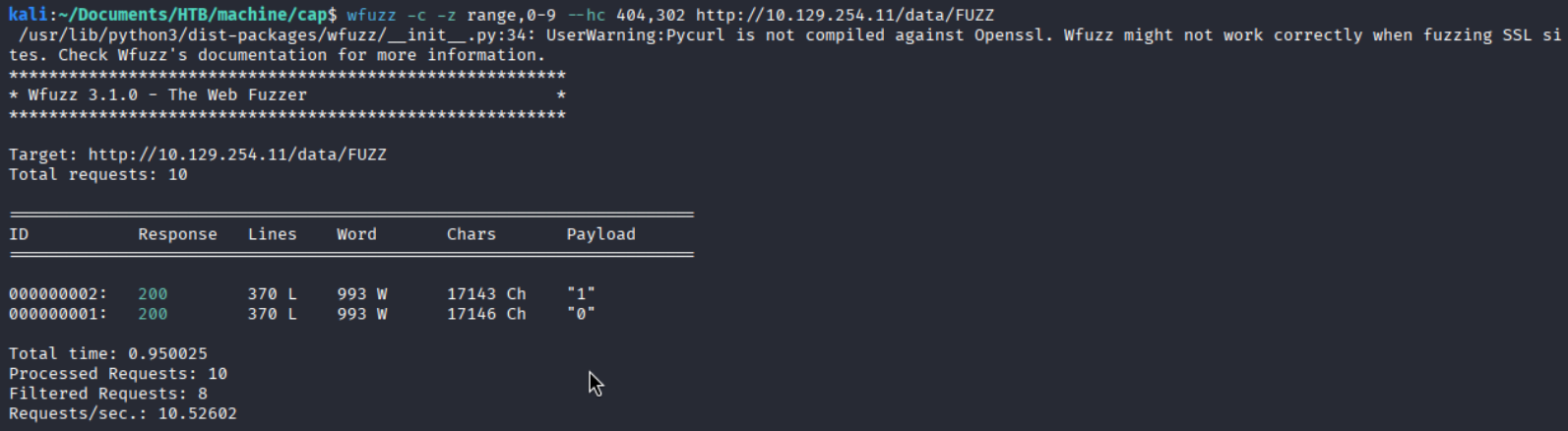 Therefore, modifying the ID value in the request could potentially reveal additional PCAP files or sensitive data. Instead of checking one by one let automate the checking process utilizing the WFUZZ tools in kali linux.