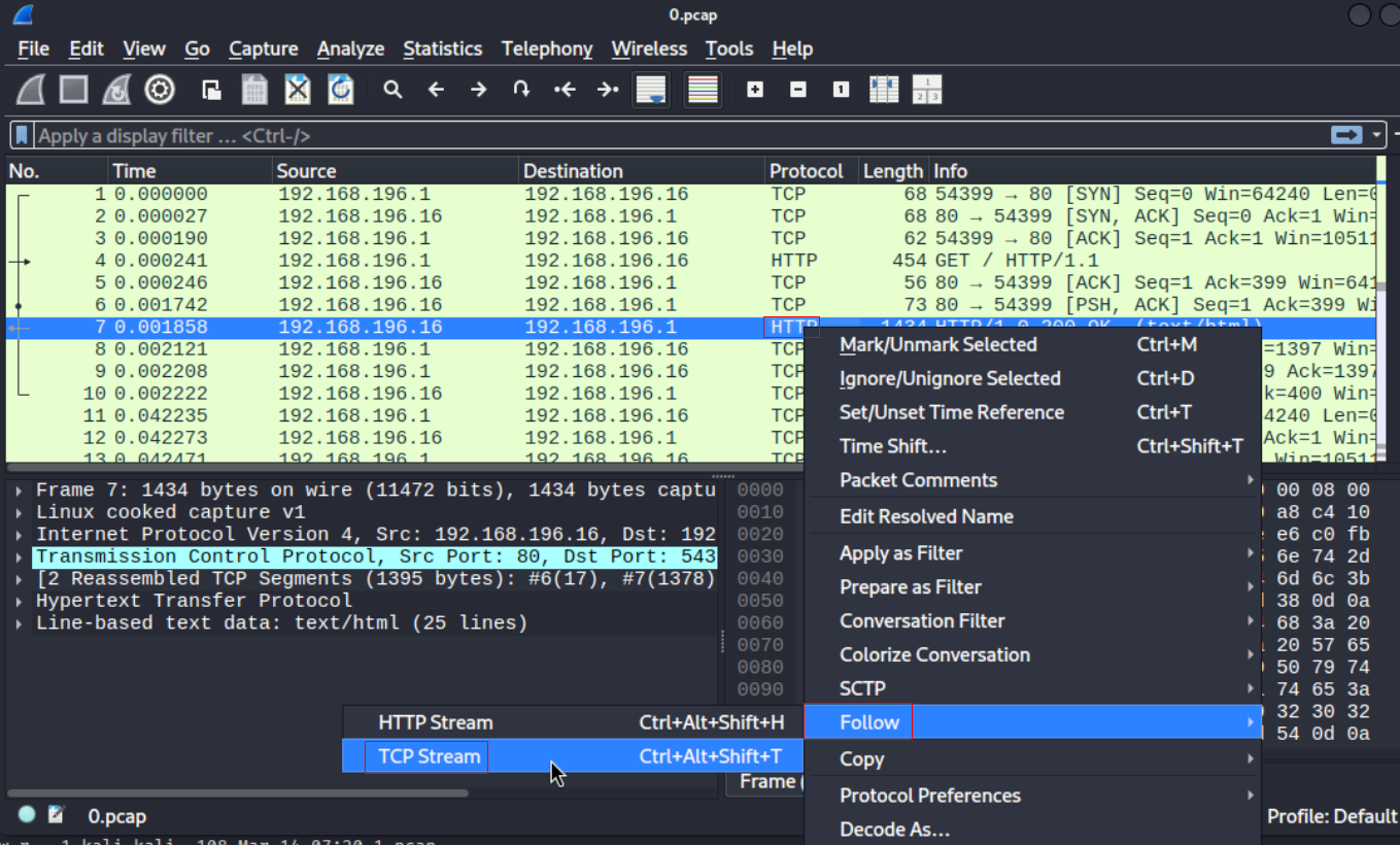 Lets analyze the pcap file using wireshark. In the file there are lots of data available including TCP, HTTP, FTP. So i started with HTTP protocol Right click on the data then Follow ⇒ TCP Stream gave us another prompt.